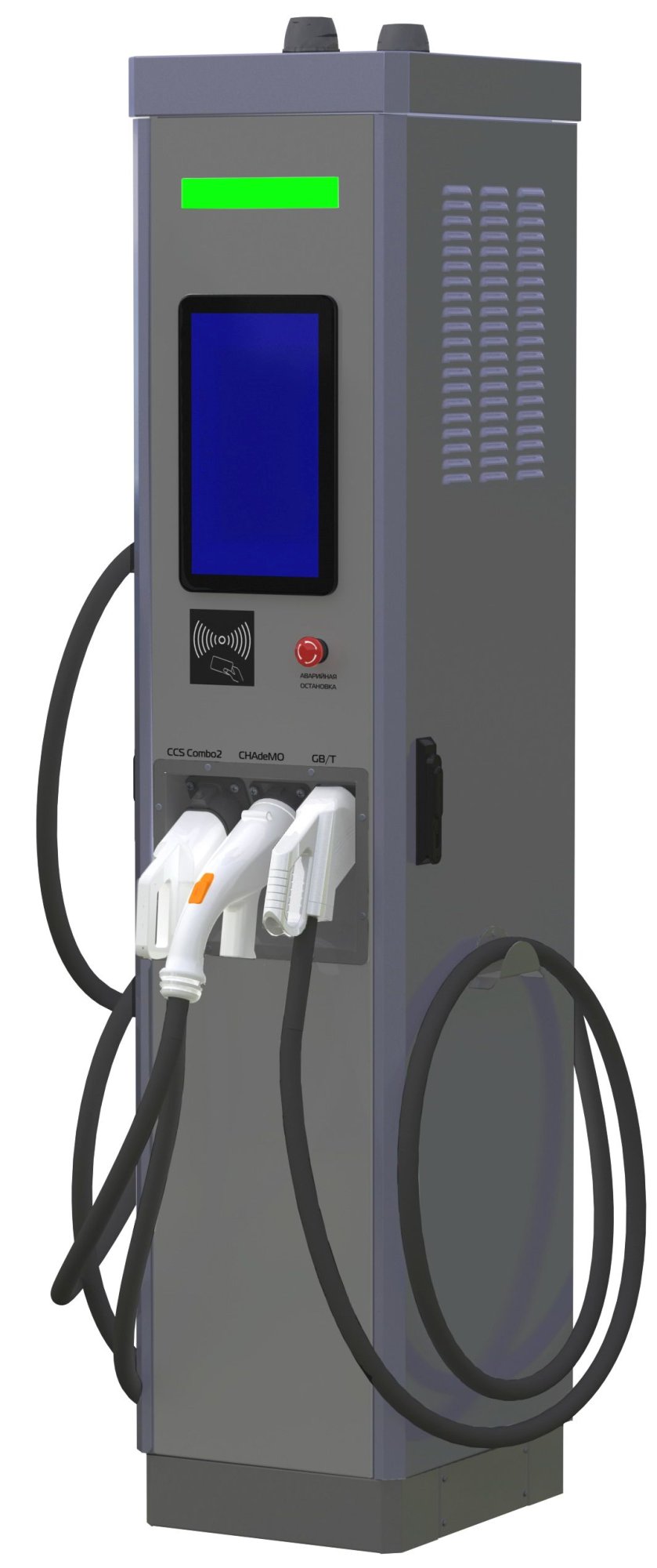 Стационарная электрозарядная станция "Витязь EC-401-15" предназначена для осуществления зарядки электромобилей постоянным током в режиме Mode 4, оснащенных разъемами ССS Combo 2, CHAdeMO, GB/T